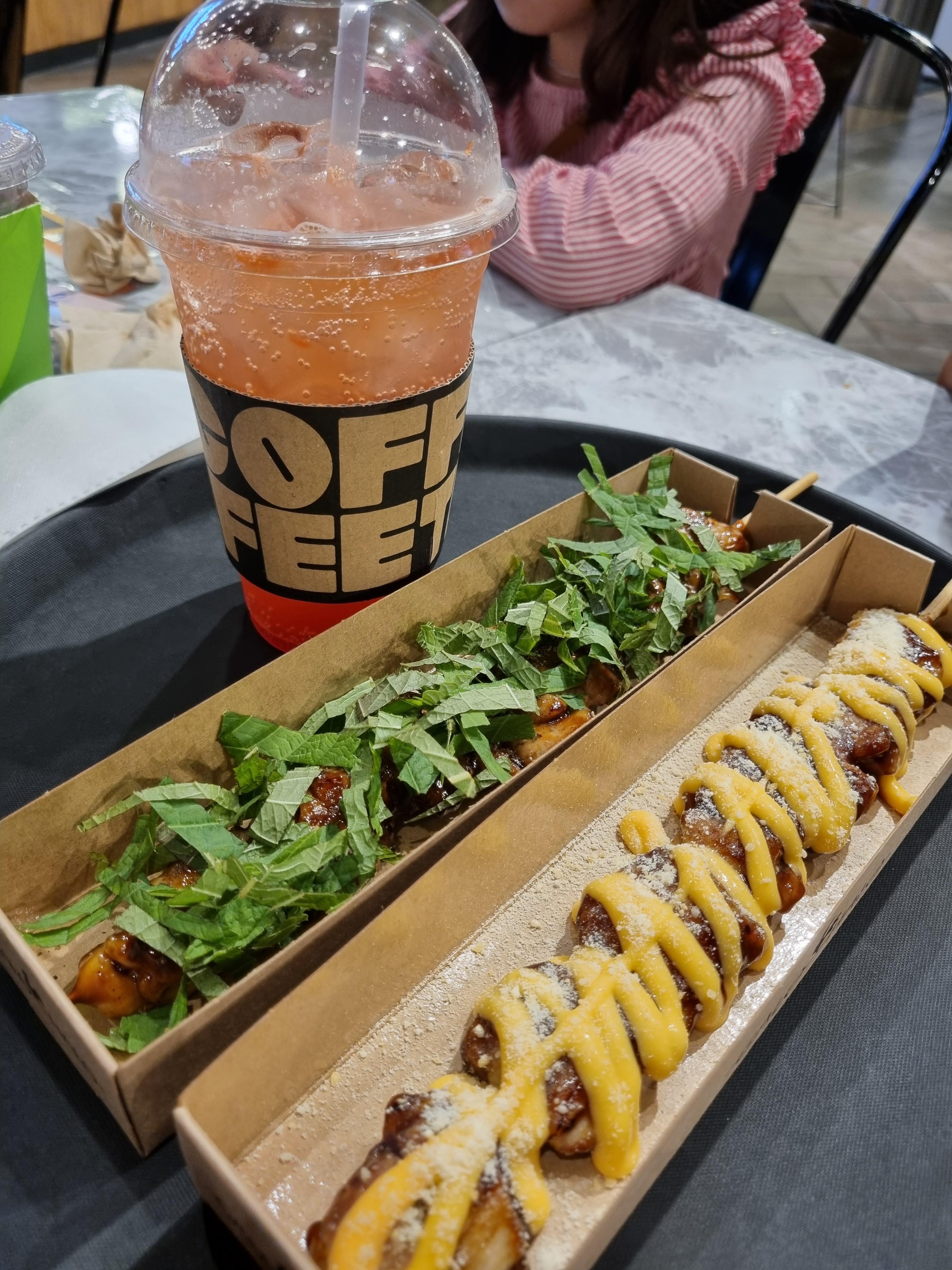 쇼핑이 끝나고 배가 출출해져서 같은건물 5층 뉴코아 아울렛 식당가로 갔어요. '갈로할로'라는 닭꼬치 집이 있길래 커플세트A를 주문했어요. 닭꼬치2개와 음료1잔에 10,000원 입니다. 음료롸 닭꼬치는 고를 수 있어요 조는 깻잎닭꼬치와 클래식닭꼬치, 자몽에이드를 선택했어요. 음식이 나오는데는 시간이 좀 걸렸지만, 닭꼬치에서 냄새도 하나도 안나고, 안매운 맛으로 선택했더니 아들도 맛있게 잘먹었어요. 아! 자몽에이드도 맛있었어요.